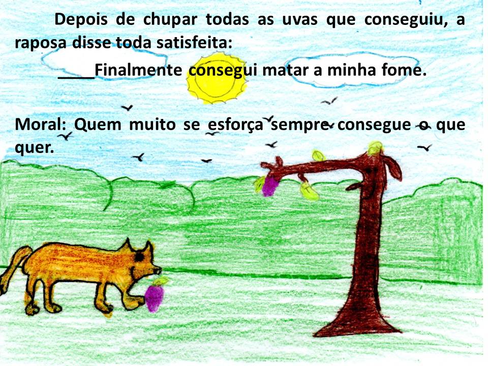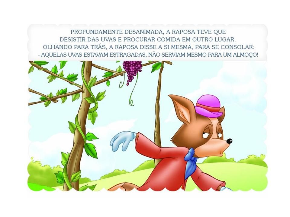 A RAPOSA E AS UVAS. Uma raposa com muita fome, andava quando encontrou uma videira muito alta. - "Que dia de sorte! Encontrei vários cachos de uvas belíssimos para me alimentar." Com bastante esforço, começou a pular várias vezes para alcançar as uvas, mas não conseguiu pegá-las, então preferiu desistir. - "Eu pensei que aquelas uvas.