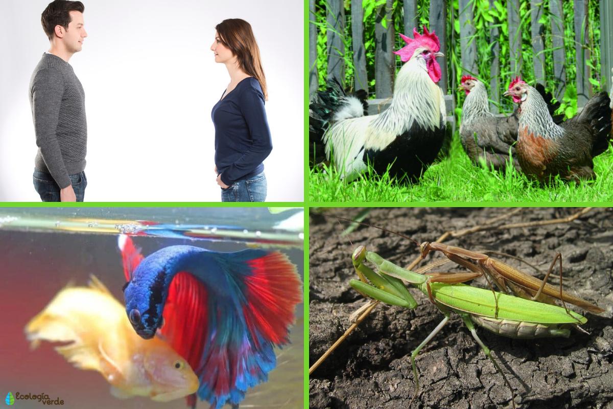 Dentro del dimorfismo sexual podemos encontrar diversos tipos: Dicromismo sexual: diferencia en el color, normalmente en versiones más llamativas, para atraer al sexo opuesto. Las hembras suelen preferir a los machos más vistosos. Dimorfismo sexual: diferencia en la forma del cuerpo o de alguno de los apéndices, dirigida a actividades específicas tanto reproductivas como de gestación.