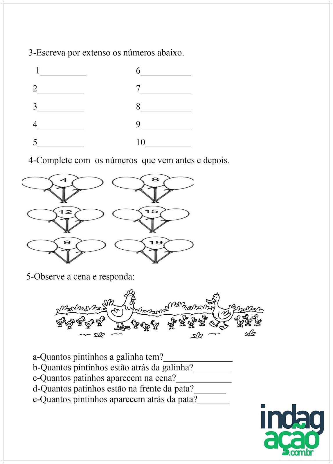 Escreva por extenso os números abaixo. Complete com os números que vem antes e depois. INDAGAÇÃO