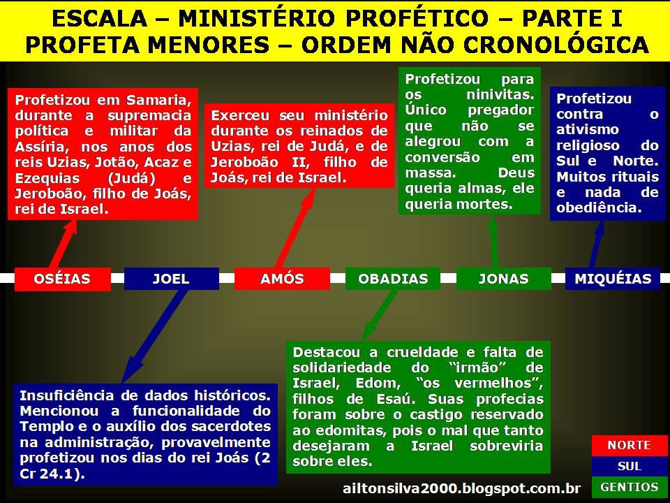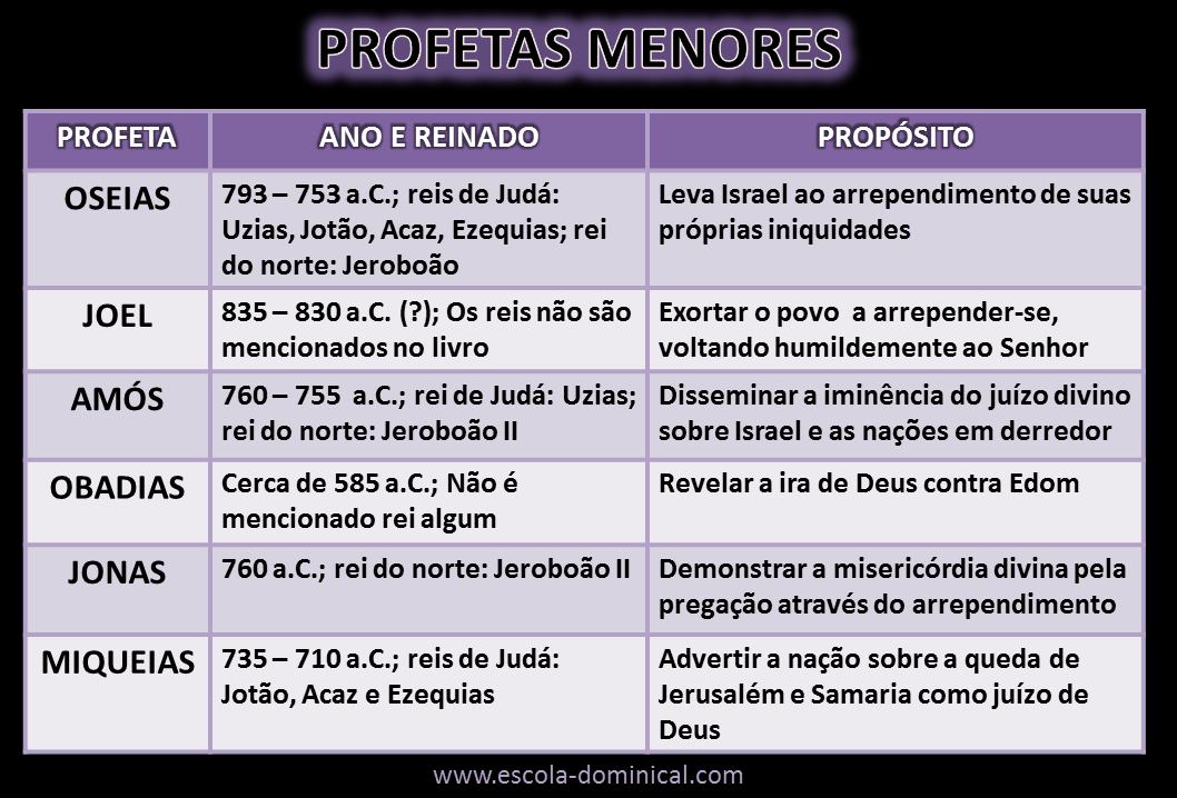 Então os Profetas Menores são: Oseias, Joel, Amós, Obadias, Jonas, Miqueias, Naum, Habacuque, Sofonias, Ageu, Zacarias, Malaquias. Livro de Oseias: foi escrito pelo profeta Oseias em cerca de 760-722 a.C. Seu propósito era mostrar o julgamento divino, e a restauração que aconteceria a seguir. Livro de Joel: o próprio profeta Joel é o.