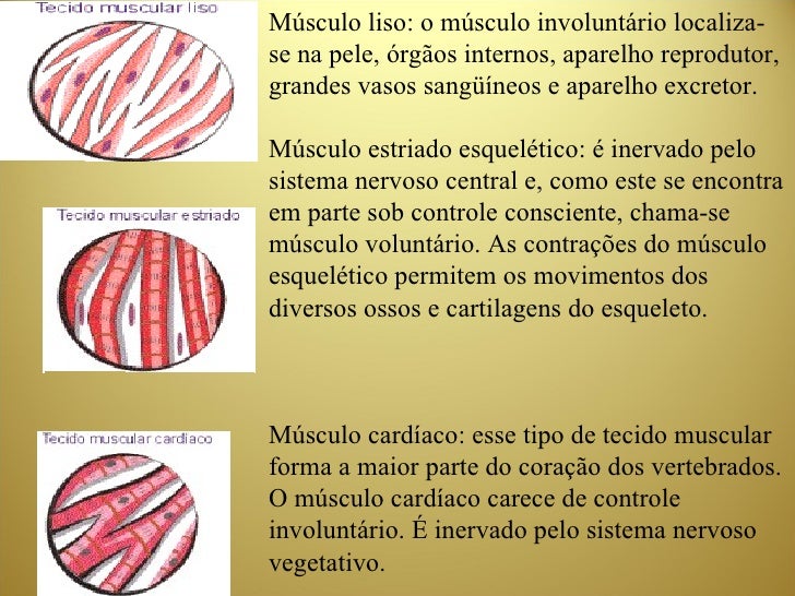 O músculo esquelético é voluntário e estriado. É o músculo que se liga aos ossos e controla os movimentos conscientes. O músculo liso é involuntário e não estriado e encontra-se nos órgãos ocos do corpo, como estômago, intestinos e ao redor dos vasos sanguíneos. O músculo cardíaco é involuntário e estriado.