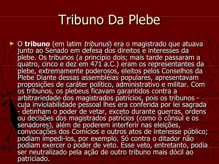 Atribuições e funções principais dos tribunos da plebe: • Defender os direitos dos plebeus romanos em contraposição aos interesses dos patrícios (aristocracia). • Incluir, nas leis romanas, direitos para os plebeus.