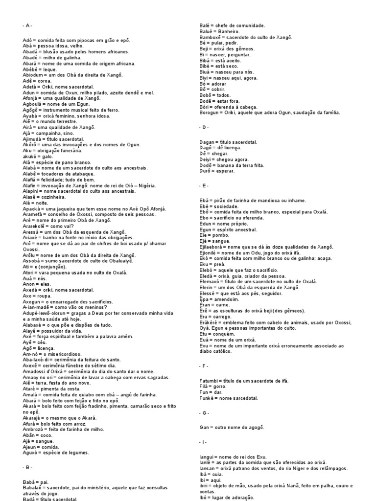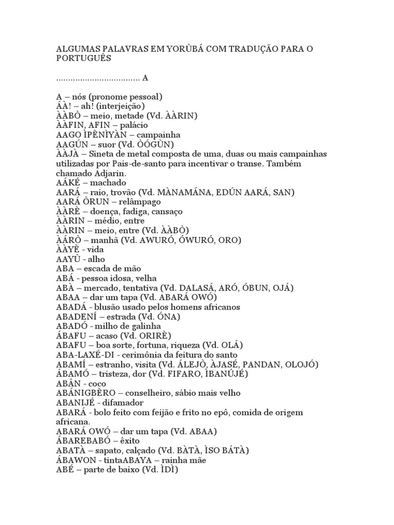 Pequeno Dicionário Yorubá o dialeto mais utilizado na nação do Candomblé (culto Afro) Gege, Nagô, Ketu, Angola, Engenho velho, Efon entre outras. São termos, palavras, objetos, entre tantas palavras mais utilizadas em nossa religião.